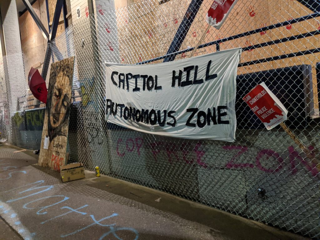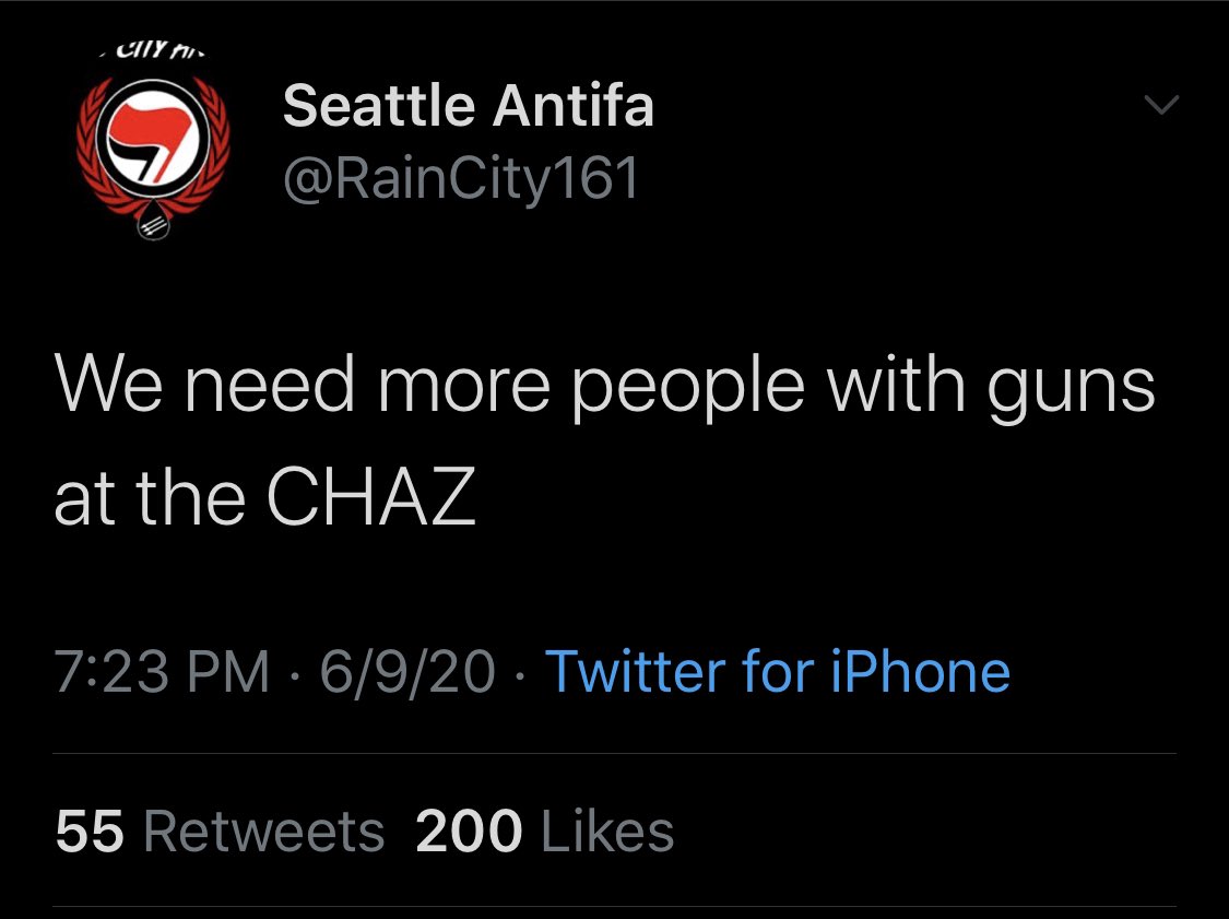 Что касается автономной зоны, созданной мафией, возглавляемой Антифой, источник, чью анонимность мы защищаем, говорит: «Они запрещают средствам массовой информации входить и проверяют входящих людей. Они ходят полностью вооруженными. Говорят о создании собственной валюты и создании их собственого флага. Полицейское управление Сиэтла говорит об отказе от западного участка.