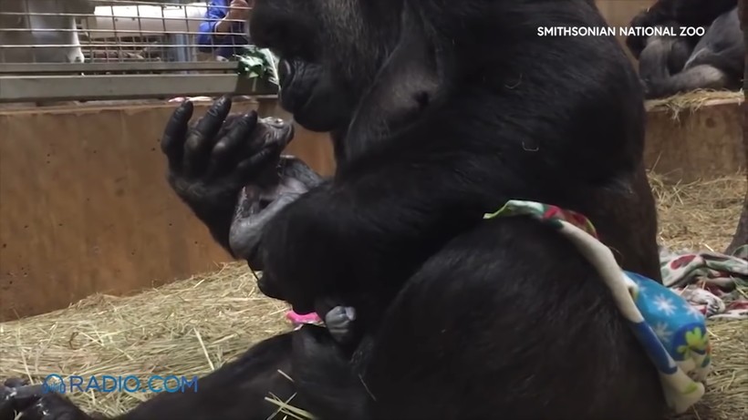 «Горилла, ставшая мамой впервые, не может перестать покрывать своего новорожденного поцелуями. Калайя — 15-летняя западная равнинная горилла, которая живет в зоопарке Смитсоновского университета. Она только что родила сына и демонстрирует ему привязанность. Младенца назвали Моки, что означает «маленький» на языке лингала, который распространен в Республике Конго. Прямо перед родами тренер научил Калайю основным навыкам материнства, таким как поцелуи и уход, чтобы повысить вероятность того, что она будет заботиться о Моки. То, что увидели смотрители зоопарка, выглядело как бесконечная любовь гориллы к детенышу», — комментирует видео диктор.