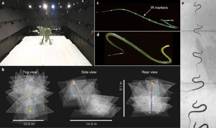 Чтобы отследить, как извиваются змеи во время полета, ведущий автор исследования Исаак Йейтон из Лаборатории прикладной физики Университета Джонса Хопкинса (штат Мэриленд, США) и его коллеги прикрепили светоотражающую ленту на спины змей и использовали высокоскоростные камеры для захвата движения.