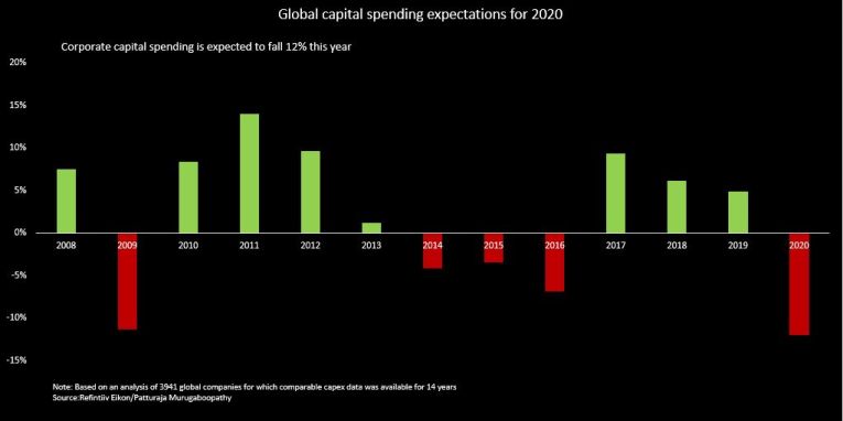 В среднем капитальные инвестиции сокращены на 12%, и это уже превосходит пиковое сокращение во время краха-2008 (тогда оно составило 11.3%).