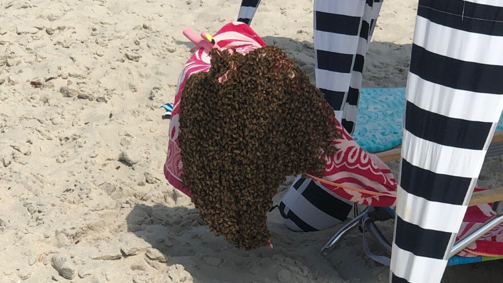 Необычное происшествие случилось на пляже Кейп Мэй в штате Нью-Джерси. Тысячи пчел слетелись на пляж и напугали отдыхавших там людей. Поначалу насекомые кружили вокруг пляжных зонтов, а затем облепили стул, на котором висело мокрое полотенце.