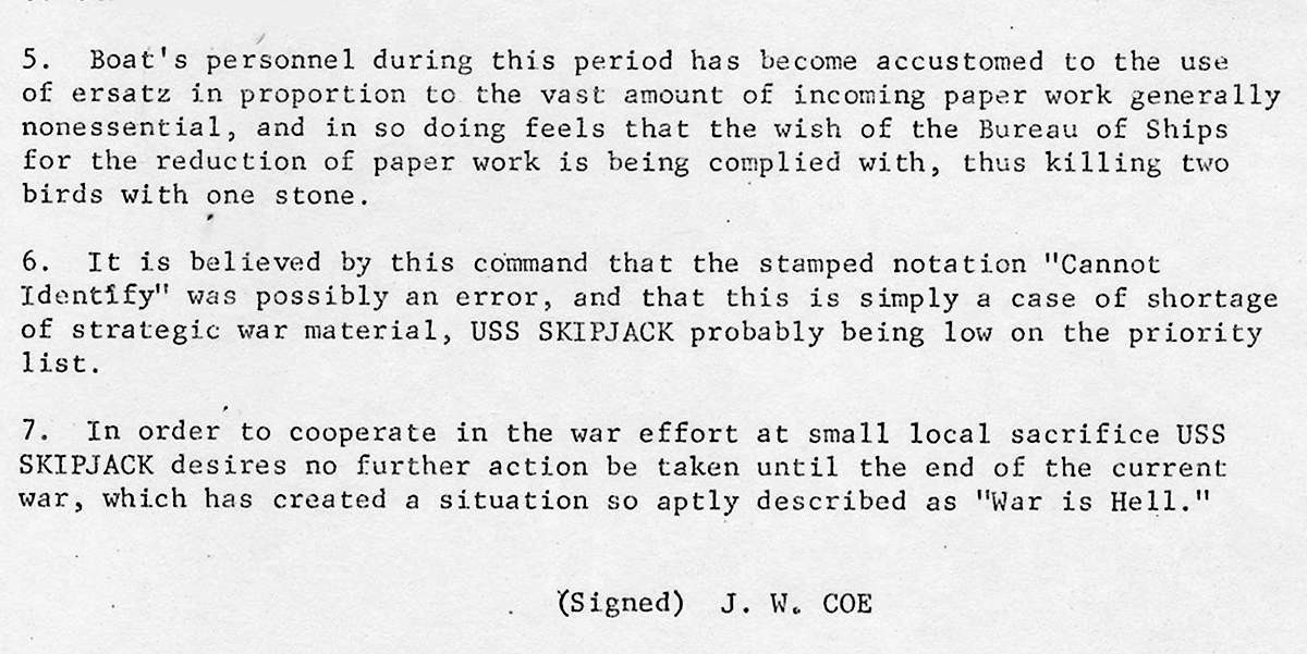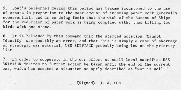 «Экипаж „Скипджека“ за это время приспособился использовать разный эрзац, а именно — чудовищное количество прибывающих бесполезных документов. Мы считаем, что это соответствует духу приказа Бюро кораблестроения о сокращении бумажного документооборота. Таким образом мы убиваем двух зайцев».