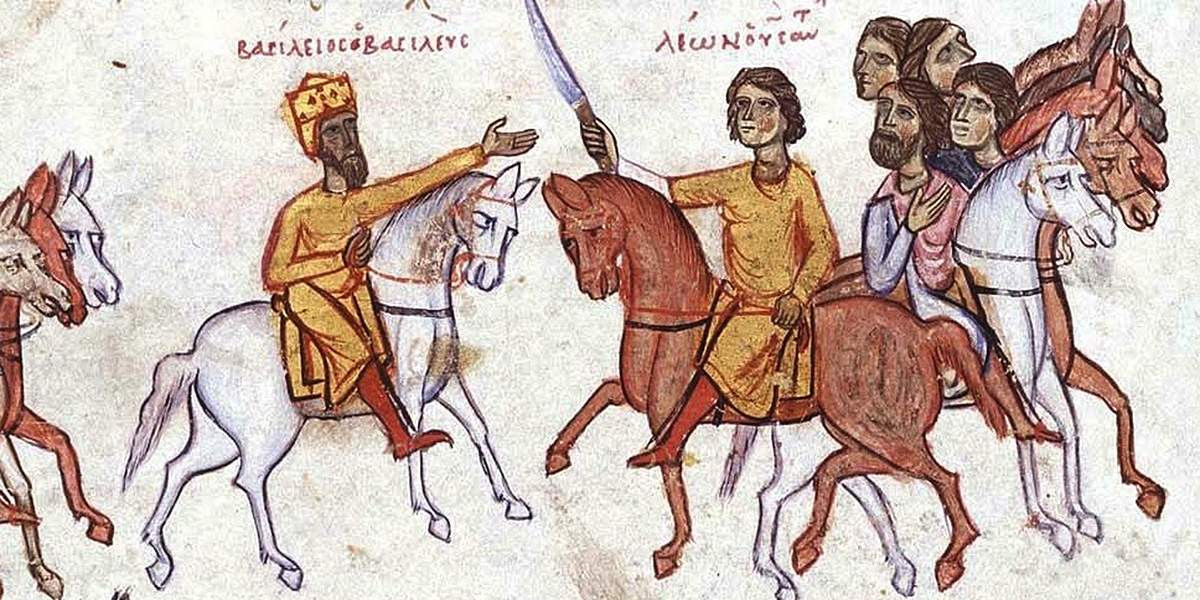 Император Василий I Македонянин и его сын Лев на конях со стременами