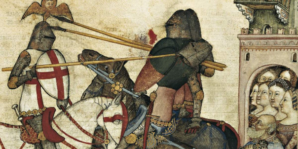 На знаменитом гобелене Байё, который иллюстрирует высадку войска Вильгельма Завоевателя в Англии в 1066 году, конники ещё воюют по-иному. Они наносят удар копьём, высоко поднимая его над головой.