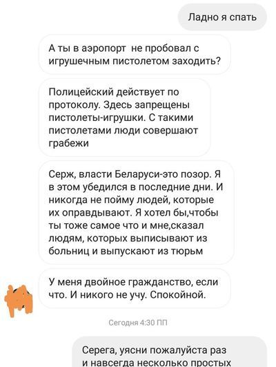 Итак. Пару дней назад Скрудж мне в инсте присылает сообщение с вопросом о том, что творится там у нас. Я в двух словах обрисовал события, указал на тот факт, что митинги были незаконные, и что власть применила непропорциональную силу при задержаниях. Во всяком случае для спокойной Беларуси, это было действительно брутально. Ну вы поймите, мы же не какие-нибудь французы, американцы, испанцы, или немцы, где подобное считается нормой. В ответ Скрудж начинает присылать видео брутальных задержаний и избиений демонстрантов ОМОНовцами. Ну я объясняю, что я это все видел, поскольку у нас куча народа подписано на телеграмм канал нехты и я в том числе (исключительно в целях оперативного получения информации о местах беспорядков дабы не встрять). Почему-то скрудж мне начинает доказывать что я неправ и что у нас чуть ли не фашистская диктатура, люди боятся криво посмотреть или сказать плохое слово про власть. Здесь нужна маленькая ремарка - когда мы везли Скруджа в аэропорт, он прям так восхищался Лукашенко и так расхваливал его сильную руку. В общем на этот пассаж я ему объясняю, что тут вот у тебя нестыковочка, как так выходит, что люди боятся лишний раз криво пукнуть, но при этом не боятся устроить абсолютно трешовый беспредел. Так же рассказываю про два основных интернет ресурса РБ тутбай и онлайнер, где только самый ленивый не плевал во власть в целом и в Лукашенко лично. При чем делал это не в последние дни, а чуть ли не с самого первого дня основания этих порталов. Скрудж продолжает присылать мне видео зверств силовиков, я еще раз уточняю, что все это видел ранее (для понимания - вся дискуссия длилась несколько дней). Некоторые видео обрезанные, то есть мы видим только факт избиения ОМОНовцами демонстрантов, но события до, остаются за кадром, на что я и указываю. В ответ мне прилетает следющее (наши орфографии и пунктуации сохранены smile31.gif):