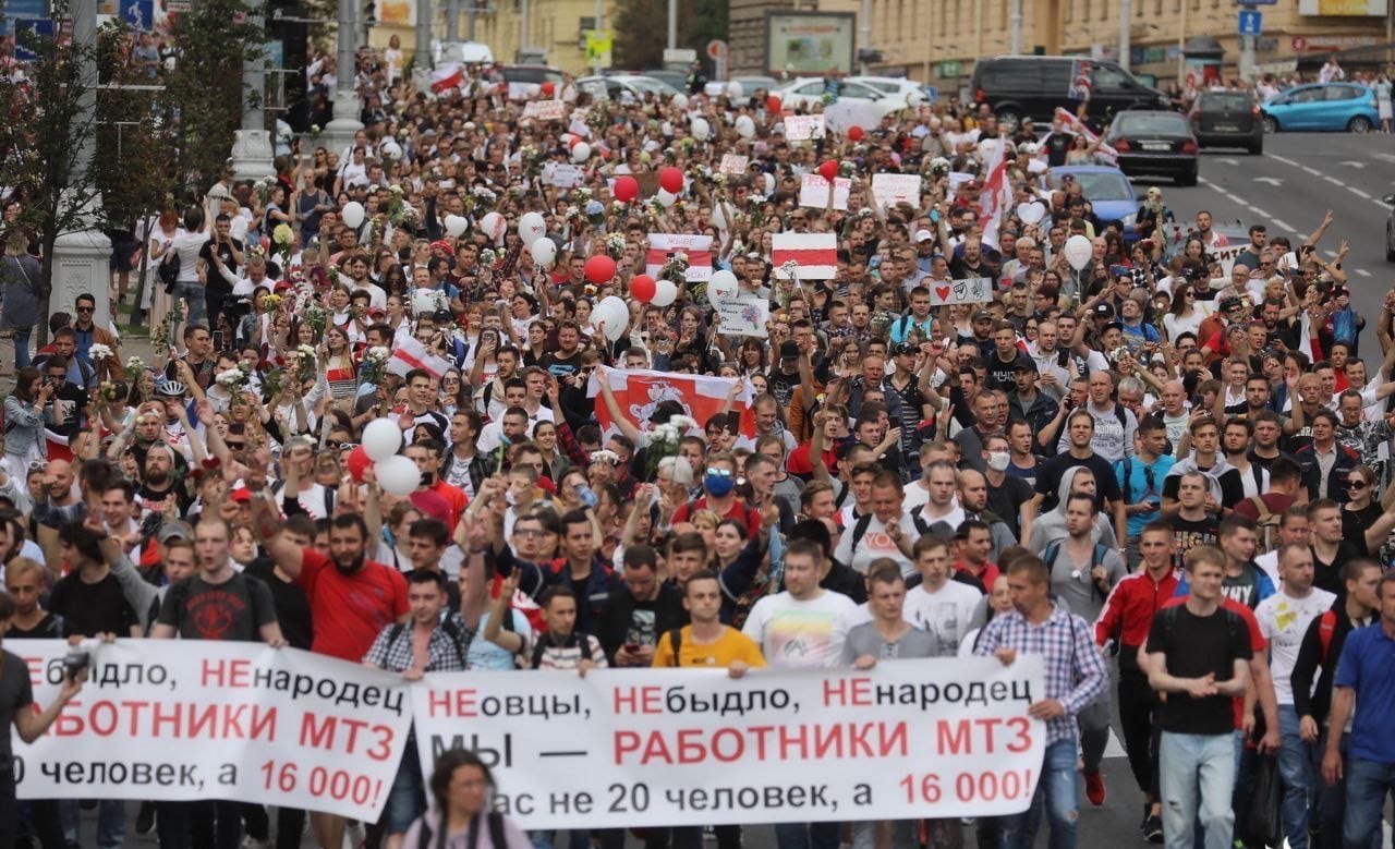 Появились и революционные лозунги. «Мы не быдло». «Я за него не голосовал». «Нет насилию». «Мы – народ, а не народец». Людей активно выводят на стачки. Забастовка проходит на Минском Тракторном Заводе. То есть там, где беларусский социализм разгулялся особенно сильно. Там, где сохранена вся социальная поддержка сотрудников: санатории, ясли, клиники.
