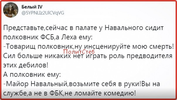 «Они охерели с Навальным. Шоу, конечно, „маст гоу ан“, но не до такой степени. В одной машине едет больной. Во второй что, анастезиолог? В третей кардиолог? В четвёртой нарколог? Ещё и полицейский эскорт? Это что за шоу? Он что в животе привёз флешку с секретными данными? Это такая спецоперация?»