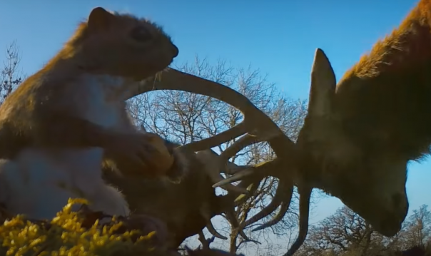 Два самца сталкиваются рогами, нападая друг на друга и совсем не обращая внимания на белку у них под ногами. Пару раз пушистой шпионке достается — одним из ударов рогов ее чуть не сбивают на землю.