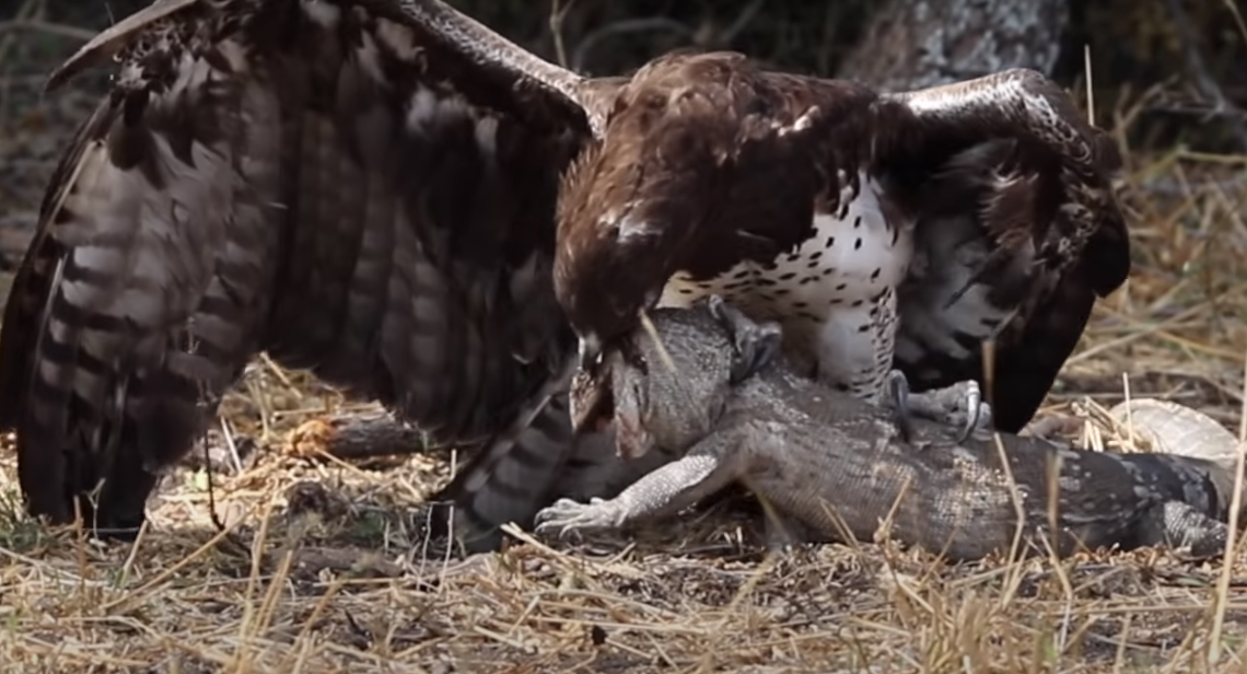 Хищная птица пригвоздила ящера к земле всем своим весом и пыталась одолеть его. В процессе схватки орел не гнушался применять жестокие приемы — например, он даже выклевал варану глаза, однако африканская рептилия не собиралась так просто сдаваться: варан медленно, но верно шел вперед и наугад бил хвостом в разные стороны, стараясь сбросить хищника.