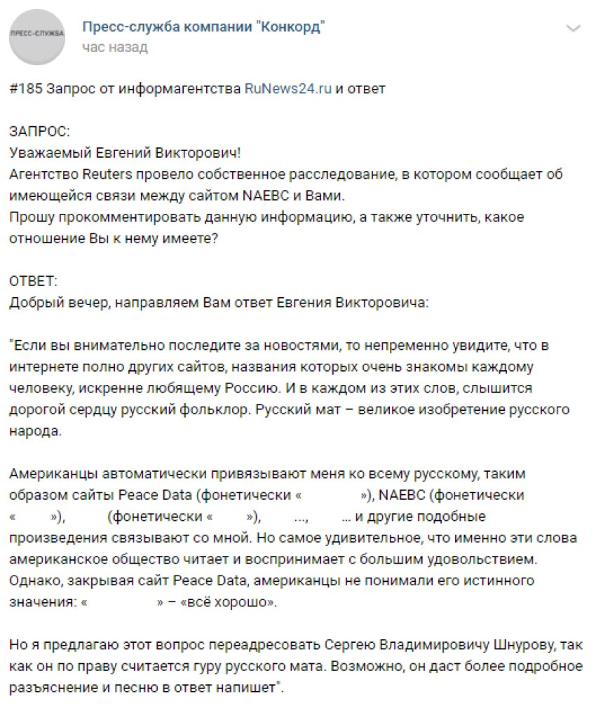 В связи с расследованием агентства Reuters, в пресс-службу компании «Конкорд» приходят запросы на имя бизнесмена Евгения Пригожина. Журналистов интересует мнение предпринимателя о связи сайта с нецензурным названием (NAEBC) с его персоной. Евгений Викторович дал ответ на интересующий RuNews24.ru вопрос, слова владельца «Конкорда» опубликовала пресс-служба компании.