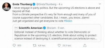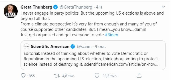И вот, снова Грета в медийном пространстве. Как бы в подтверждение своих слов, шведская экоактивистка призвала американцев голосовать за демократа Джо Байдена.