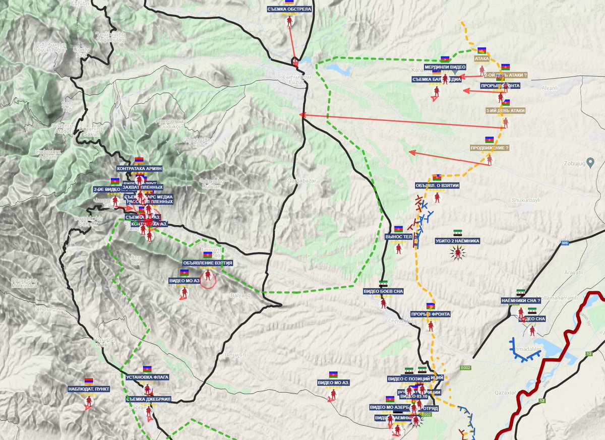 Также во второй половине дня 15 октября появилось первое видео из Гадрута. Таким образом к 16 октября Азербайджан таки смог войти в Гадрут (возможно город еще не полностью зачищен, но после потери высот, с юга и севера, особого смысла за него цепляться уже нет), о взятии которого было объявлено 9 октября. Чтобы натянуть реальную ситуацию на военную пропаганду потребовалась неделя. Армяне неделю поупирались, но как-то относительно легко уступили прилегающие высоты, хотя потеря Гадрута уже в ближайшие дни приведет к полной потере Физули и прилегающих сел. Уже вчера азербайджанцы заняли пачку разрушенных сел и вели бои уже непосредственно в районе Физули, где по ним работала армянская артиллерия. О взятии Физули пока не заявлялось, но полагаю, это вопрос ближайших дней. Далее Азербайджан может пытаться развивать наступление через горные районы вглубь НКР или же напрячь оборону армян у Мартуни.