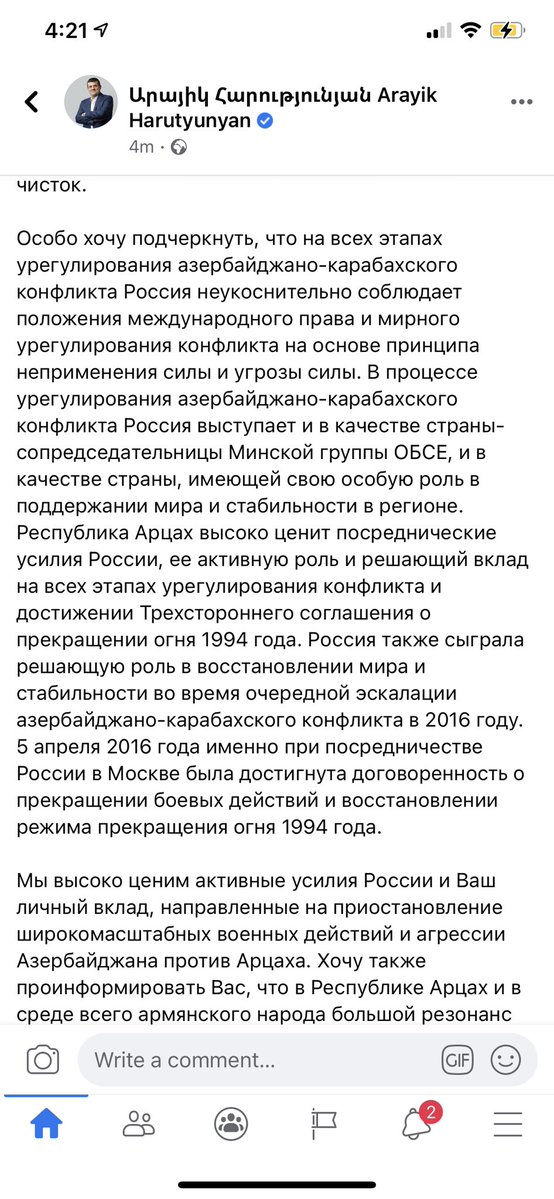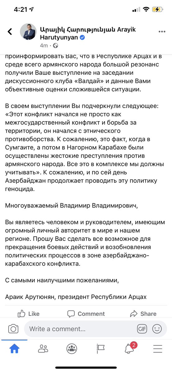 На фоне очень сложной для армян оперативной обстановке на фронте, президент Карабаха Арутюнян пишет открытое письмо Путину.