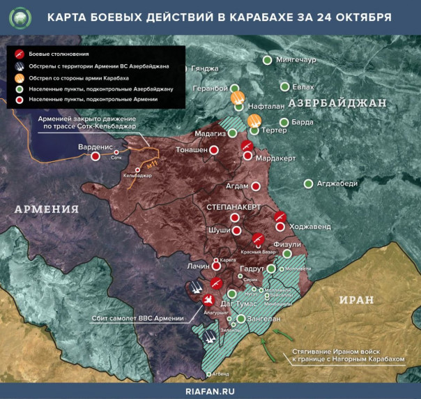Постепенно подтягивая РСЗО к северу от Ханлыка, Азербайджан уже 22-23 октября начал вести обстрелы Лачинского коридора, что вкупе с ударами дронов, уже сейчас создает некоторые проблемы с использованием Лачинского коридора. Вполне очевидно, что, зачистив границу с Ираном и выстроив фронт вокруг Зангелана, Азербайджан начнет подтягивать резервы на фронт к северу от Ханлыка, чтобы развить уже более основательное наступление на Лачинский коридор, используя не только дорогу от Ханлыка, но и прилегающие горы, по которым спецназ и горнострелки могут просочиться через оборону армян и установить прямой огневой контроль над Лачинским коридором.