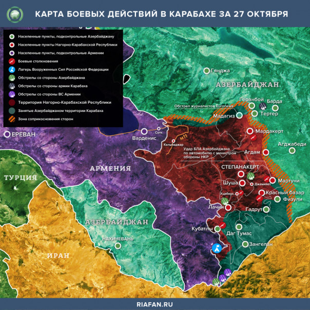 Азербайджанские части при поддержке Турции продолжают вгрызаться в оборону защитников Арцаха, которым, в свою очередь, оказывает поддержку Армения. Но силы явно неравны, и Армия обороны НКР, пусть и медленно, отступает.