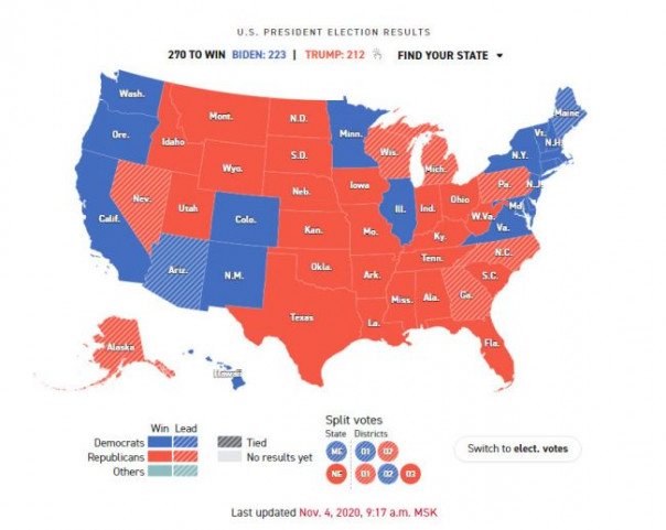 У Байдена на подходе были только: Миннесота (10), Аризона (11), Мэйн (2) и Гавайи (4). Итого: 236 голосов выборщиков.