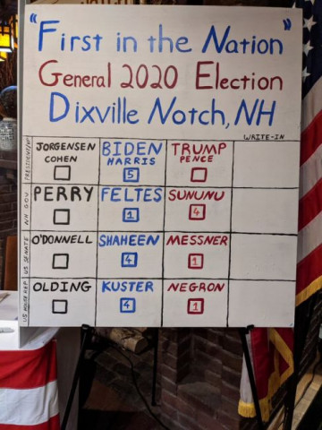 Первые чисто символические результаты «для разогрева» электората были объявлены уже рано утром в день голосования по двум крошечным селениям в штате Нью-Гэмпшир — Диксвилл-Нотч и Милсфилд. В Диксвилле пять человек проголосовали за Джо Байдена, а в Миллсфилде с большим перевесом победил президент-республиканец Дональд Трамп. Дебют стал знаковым для последующего развития событий в пользу действующего президента.