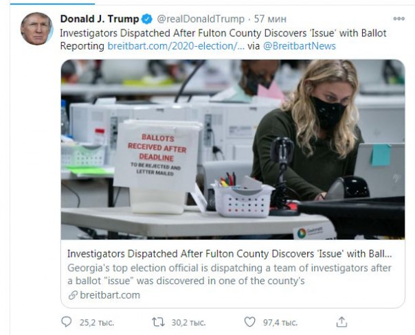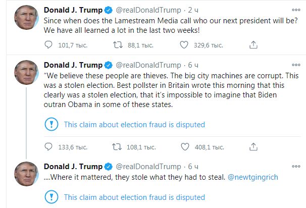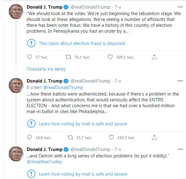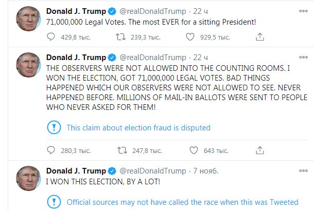 Наблюдателей не допустили в комнаты для подсчета голосов. Я выиграл выборы, набрал 71 миллион законных голосов. Случилось много плохих вещей, которые нашим наблюдателям не позволили увидеть. Такого раньше не было. Никола не было. Миллионы почтовых бюллетеней разослали людям, которые о них никогда не просили! - написал президент.
