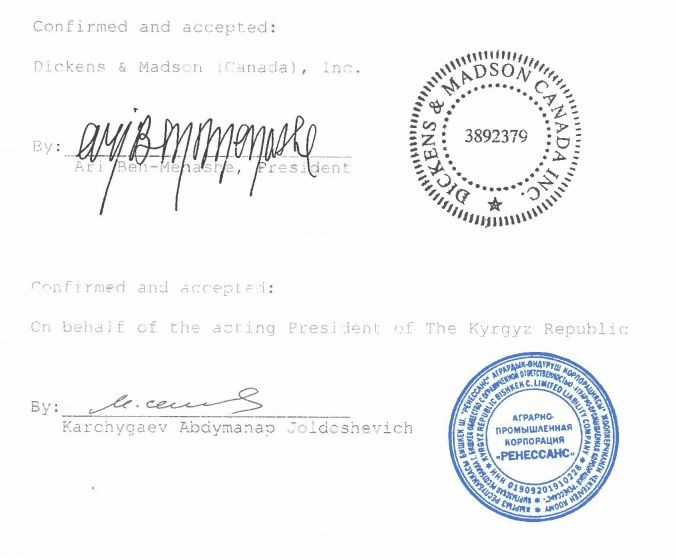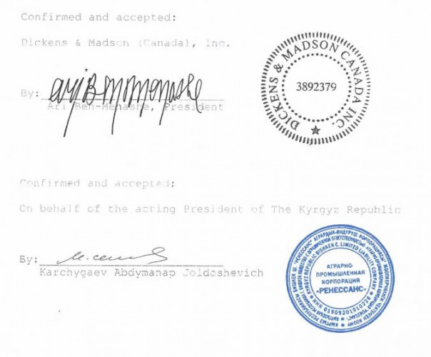 Половину этой суммы исполнители уже получили. В роли заказчика выступает упомянутый выше А. Карчыгаев, который действует от имени и. о. президента Киргизии С. Жапарова: подпись с Карчыгаева скреплена печатью аграрно-промышленной компании «Ренессанс». Согласно базе данных Минюста Киргизии, «Ренессанс» занимается растениеводством и животноводством.