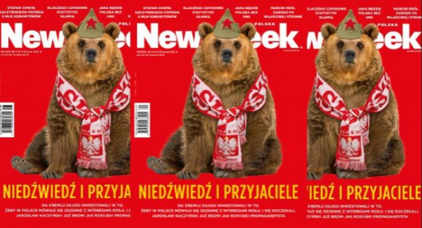 Обложка анонсирует статью номера «Медведь и приятели», в которой обозреватель Мариуш Ковальчик пишет, что лидер русофобской польской правящей партии «Право и справедливость» Ярослав Качиньский на самом деле «реализует сценарий Путина».