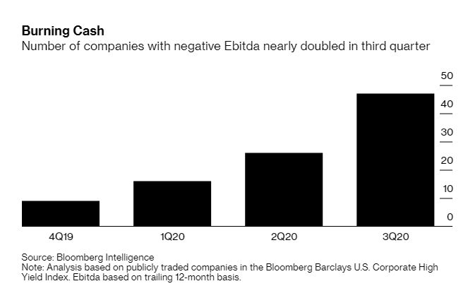 Но теперь бизнес США (если понятие "бизнес" применимо к этой клоунаде в принципе) кишит еще и "суперзомби" - это те компании, кто не может покрыть без набора долгов не только выплату процентов по старым долгам, но и текущие операционные расходы (за вычетом обслуживания долгов). Формальным критерием является наличие отрицательной EBITDA.