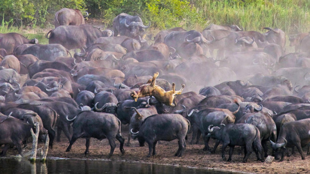 Вне себя от паники, животные то и дело поднимали хищницу на рога, подкидывая ее, словно пушинку, а затем роняли на землю и продолжали топтать ее. Вскоре безжизненное тело львицы оставили на берегу в покое. Туристы могли слышать неподалеку зов другого льва, но они так и не увидели его, хотя позже поехали дальше в поисках прайда.
