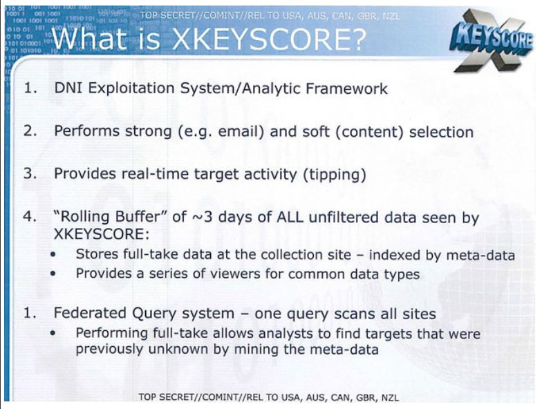 Известный журналист Гленн Гринвальд описывал XKEYSCORE как «широко распространенный» инструмент АНБ для сбора «почти всего, что пользователь делает в Интернете». АНБ установило данную программу примерно в 150 точках сбора данных по всему миру. В этих точках используются и традиционные селекторы, такие как номера телефонов и адреса электронной почты, чтобы выбрать интересующие сведения, но данный способ устарел, поскольку пользователи, зная, что за ними может вестись слежка, переходят на анонимные мессенджеры.