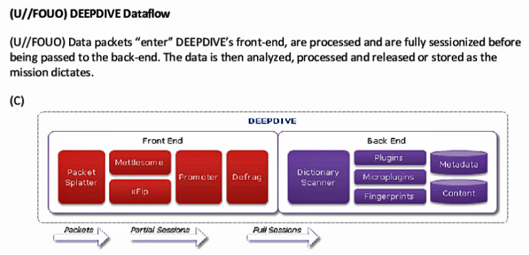 Программа XKEYSCORE упомянута также в секретном файле немецкой внешней разведки BND, показывающем разницу между XKEYSCORE и традиционными системами сбора данных: в традиционной настройке IP-пакеты из потока данных собираются повторно, затем проходят через фильтр, выбиравший то, что представляет интерес. XKEYSCORE делает всё это сразу.