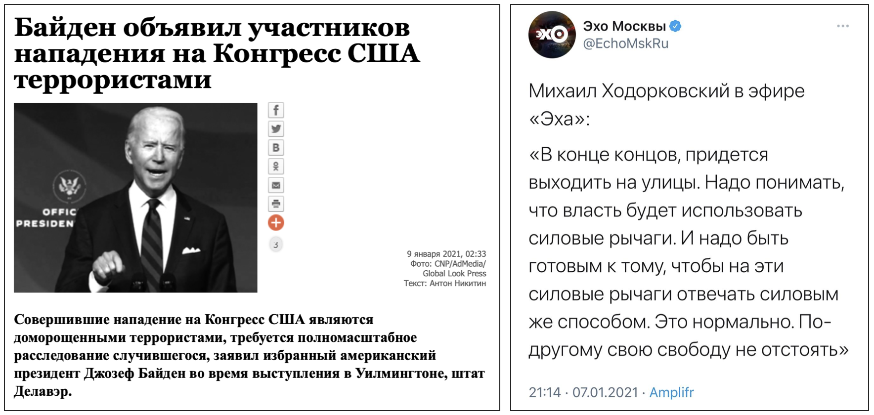 В это же время Ходорковский на Эхе Москвы рассказывает, что надо выходить на улицы и давить на власть силовыми способами, потому что "по-другому свободу не отстоять". С точки зрения США и Байдена, Ходорковский призывает граждан ... да к терроризму же! Но это по логике, потому что в реале граждане со светлыми лицами объяснят .... правильно, что ЭтоДругое и ПониматьНадо.
