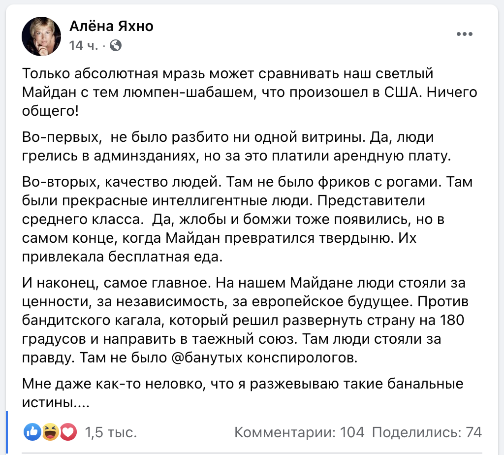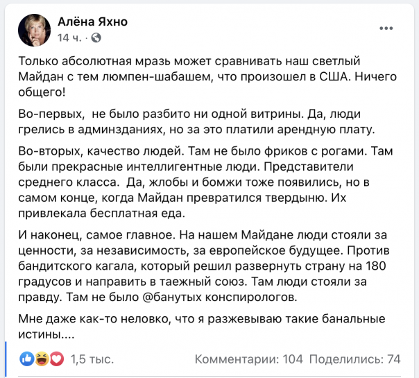 Особенно порадовало "там не было фриков, только прекрасные интеллигентные люди". Может я в соцсетях какой то другой Майдан наблюдал, потому что на украинском были сотни унылых западенских урёбищ в кастрюлях. Ну и про "ни одной витрины не разбито, люди грелись в зданиях и платили арендную плату" оставлю без комментариев :)))