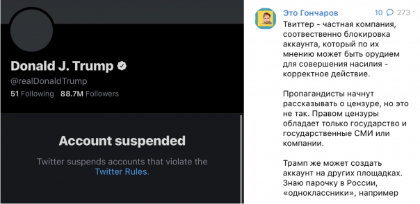 Твиттер навсегда забанил Дональда Трампа. За подстрекательство к насилию. В чем именно заключается подстрекательство непонятно, но кому в наше время нужны доказательства. Российские неполживцы тут же принялись объяснять, что это никакая вовсе не цензура, ЭтоДругое и ПониматьНадо.