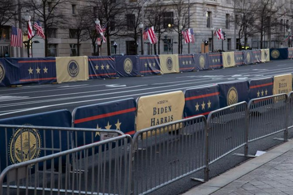 Баннеры к инаугурации избранного президента США Джо Байдена на ограждении дороги у здания Капитолия в Вашингтоне