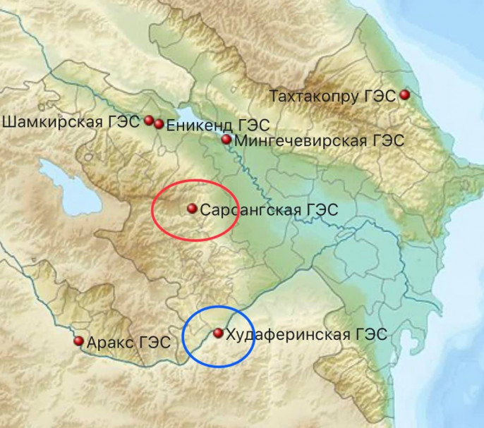 Азербайджанская Мингечевирская ГЭС, построенная на Куре в 1954 году, по-прежнему остается крупнейшей в Закавказье – ее установленная мощность составляет 425 МВт. Синий кружок на карте – ГЭС проекта "Худаферин", которые теперь находятся на территории, подконтрольной Азербайджану. Красный кружок – Сарсангская ГЭС мощностью 50 МВт на реке Тертер, одна из шести ГЭС, которые по соглашению от 10.11.2020 остались под контролем непризнанной НКР. Установленная мощность остальных пяти ГЭС составляет еще 25 МВт, и о том, будут ли эти ГЭС работать только на потребителей НКР или есть возможность использовать их еще и для нужд планируемого электромоста, предстоит принимать отдельное решение.
