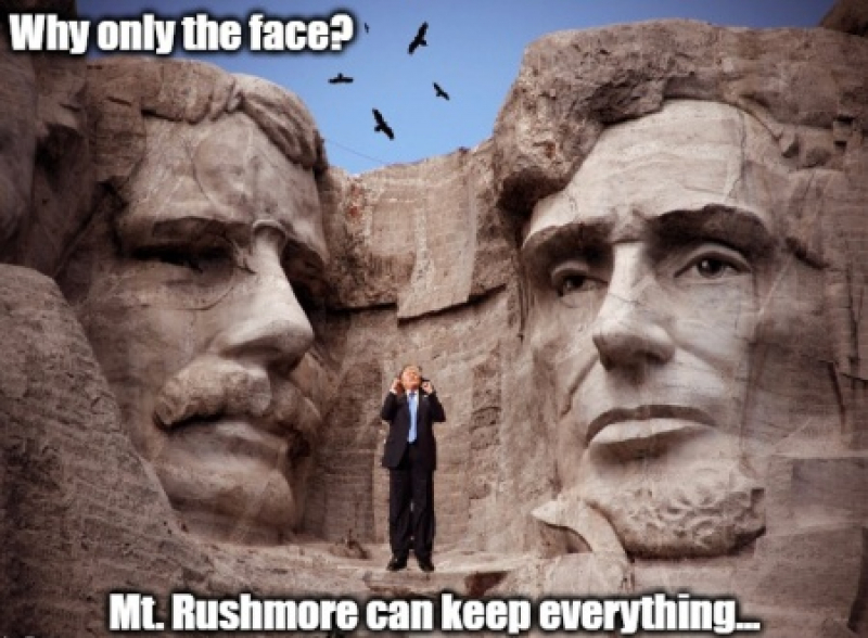 А что голова на горе, названной в честь Чарльза Рашмора бизнесмена-организатора экспедиции, впервые посетившего этот район в 1885 году? А всё возможно, потому что большое реально видится на расстоянии. И до колонизации Америки эта гора на языке племени лакота (дакота) называлась «Шесть праотцов». И место, стало быть, есть и для пятого — Трампа и даже для шестого. Например, того, кто примирит США и тем самым спасёт их от развала. Лишь бы нашёлся такой человек, который занимался бы больше США, нежели Россией и всем остальным миром... Источник