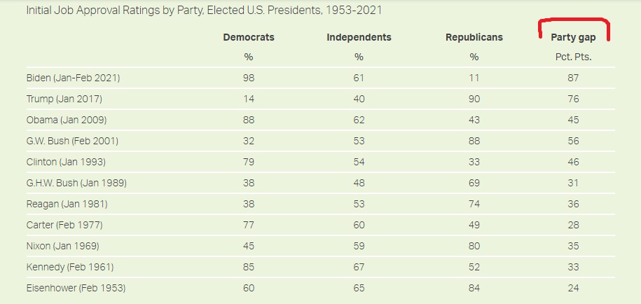 Так вот, они пару дней назад опубликовали результаты первого такового опроса при президентстве Байдена (он получил 57% одобрения). Есть данные и в разрезе партийной принадлежности опрашиваемых граждан (демократы-независимые-республиканцы). Gallup решил сравнить данные по первому опросу при Байдене с другими тоже первыми (для пущей сопоставимости) опросами предыдущих президентов. Начиная ажно с 1953 года. Получилось предельно наглядно. Внимание - на крайний справа столбец. В нём разница между демами и респами.