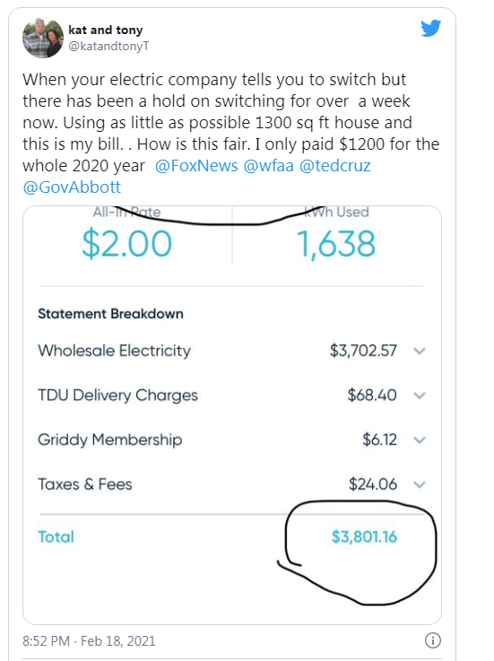 Есть одна компания на рынке Техаса (griddy), которая предлагает за небольшую месячную плату покупать электричество по оптовым ценам. В обычное время это 3-4 цента за кВт/ч, что значительно дешевле и можно экономить. Но в связи с недавними событиями, цена на оптовом рынке скакнула на тысячи процентов (был даже топик о том, что с такими ценами заправить теслу стоит под 900$ вместо обычных 20$). Те потребители, кто не успел переключиться с griddy на другие компании плакали горькими слезами. Мой коллега только за пятницу (когда уже пошло немного холодать) заплатил 150$, при счёте в 50$ за январь. С воскресенья другие компании перестали брать новых клиентов, клиенты griddy плакали ещё больше. Стоимость Квт/ч достигала 9$ (в 3000 раз больше обычной).