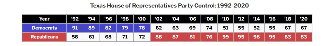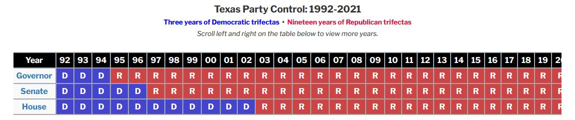 После победы Джорджа Буша-младшего на выборах губернатора Техаса республиканцы перехватили власть в штате и с 2003 года удерживают все три главные позиции – губернатор, сенат и палата представителей. В 2022 году там пройдут выборы: