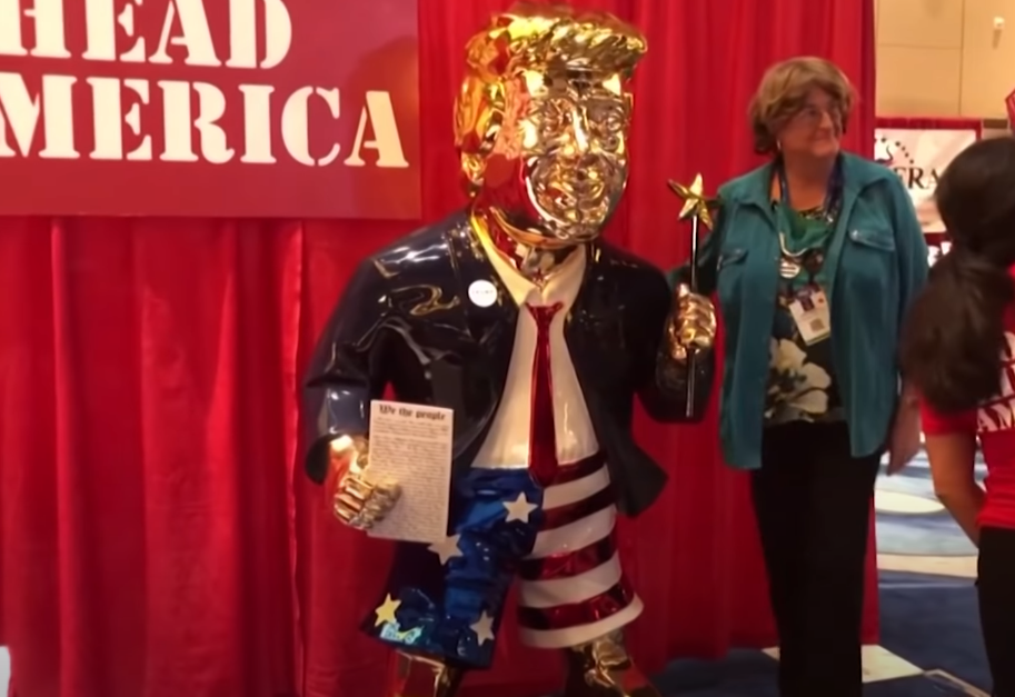 В Орландо, штат Флорида, на конференции консерваторов США (CPAC) установили золотую статую Дональда Трампа, облаченную в патриотичные шорты, сланцы, пиджак и красный галстук.