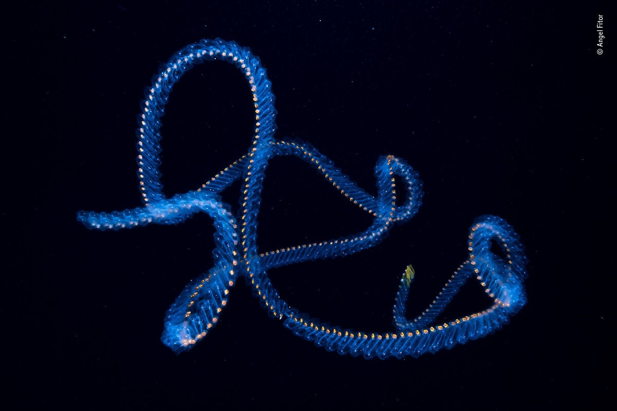Юные светящиеся сальпы сидят на материнском столоне. Считается, что свечение нужно для привлечения планктона.