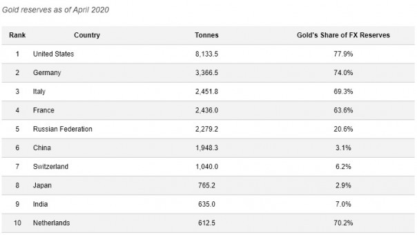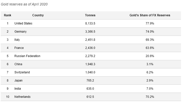 Ещё один показатель, который мы можем использовать - это общие запасы золота. Эти цифры также повторяют экономическое положение, поскольку только самые экономически сильные страны входят в топ-10 примерно в том же составе, что и их официальный ВВП. Золото уже давно является красноречивым показателем мощи, престижа и экономического статуса страны. На приведенной ниже диаграмме мы опять видим, что Россия занимает почти такое же положение, как и на всех других приведенных выше диаграммах.