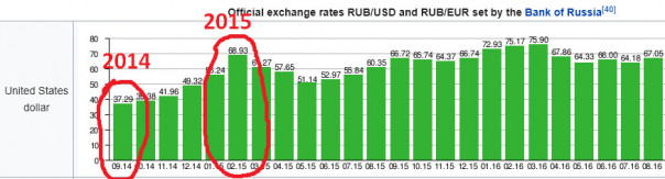 Как видно, в это же самое время курс доллара к рублю поднялся с минимума ~37 рублей за доллар в 2014 году (график выше) до диапазона ~60-75 рублей за доллар уже в следующем году, что точно совпало с обвалом цен на нефть. Чудесным образом девальвация соответствует точному сроку и тяжести обвала нефти - цена упала вдвое с ~100 до ~50 долларов, а рубль подешевел с ~35 до ~70 по отношению к доллару к 2015-2016 годам.