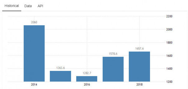 Как видно из приведенной ниже диаграммы, ВВП России по данным этого источника в 2014 году составил $2,060 млрд, а к 2016 году, как по волшебству, сократился до $1,282 млрд. Это представляет собой примерно ~40% - ное снижение в соответствии с обвалом рубля.