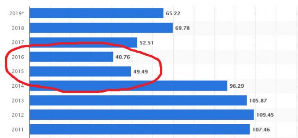 Атлантисты приняли меры и вместе со своими саудовскими "партнёрами" (подчинёнными) осуществили план обвала цены на баррель нефти, чтобы максимально навредить России, поскольку её экономика в то время была еще немного более зависимой от нефти и не такой диверсифицированной, нежели сегодня. Такие большие тектонические сдвиги требуют времени, поэтому их проекты заняли год или два, чтобы полностью просочиться на рынки, и к 2015-2016 годам цена на нефть упала с вышеупомянутого диапазона ~100-115 долларов за баррель до диапазона ~40-50 долларов за баррель, потеряв примерно ~50% от её первоначальной цены. Это наглядно демонстрирует приведенная ниже диаграмма.