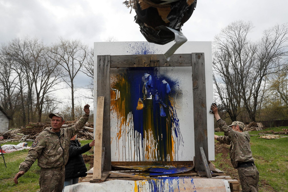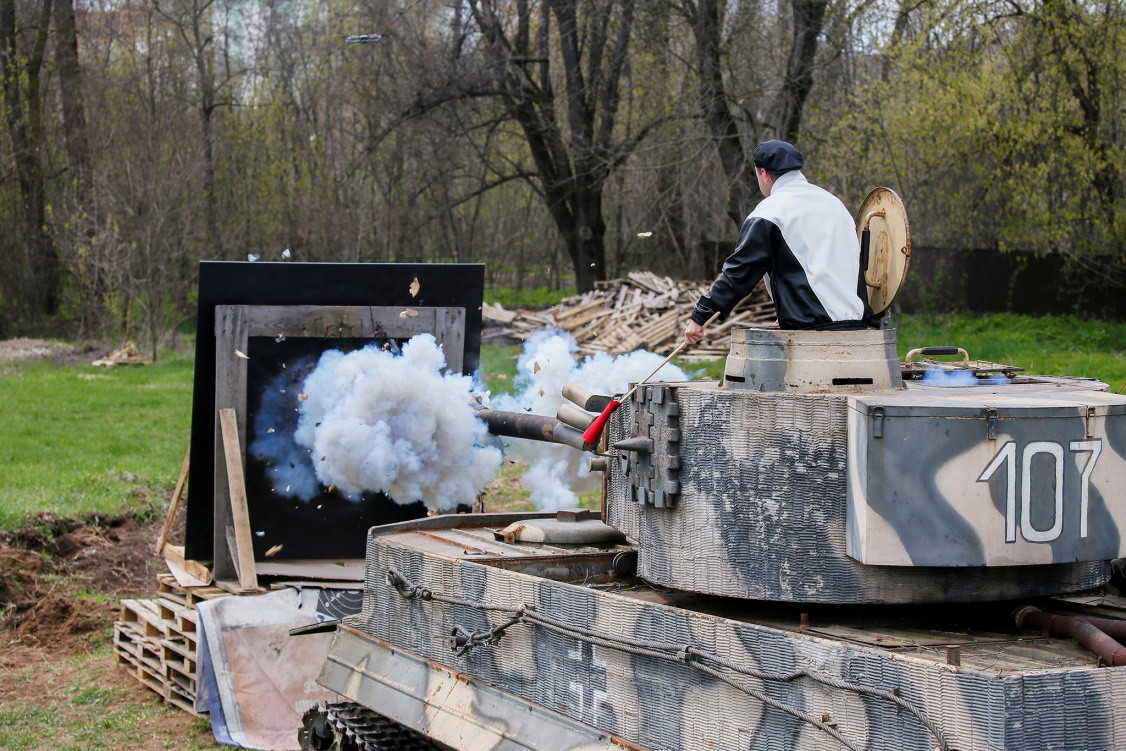 Художник расстреливает заготовки из танковой пушки.