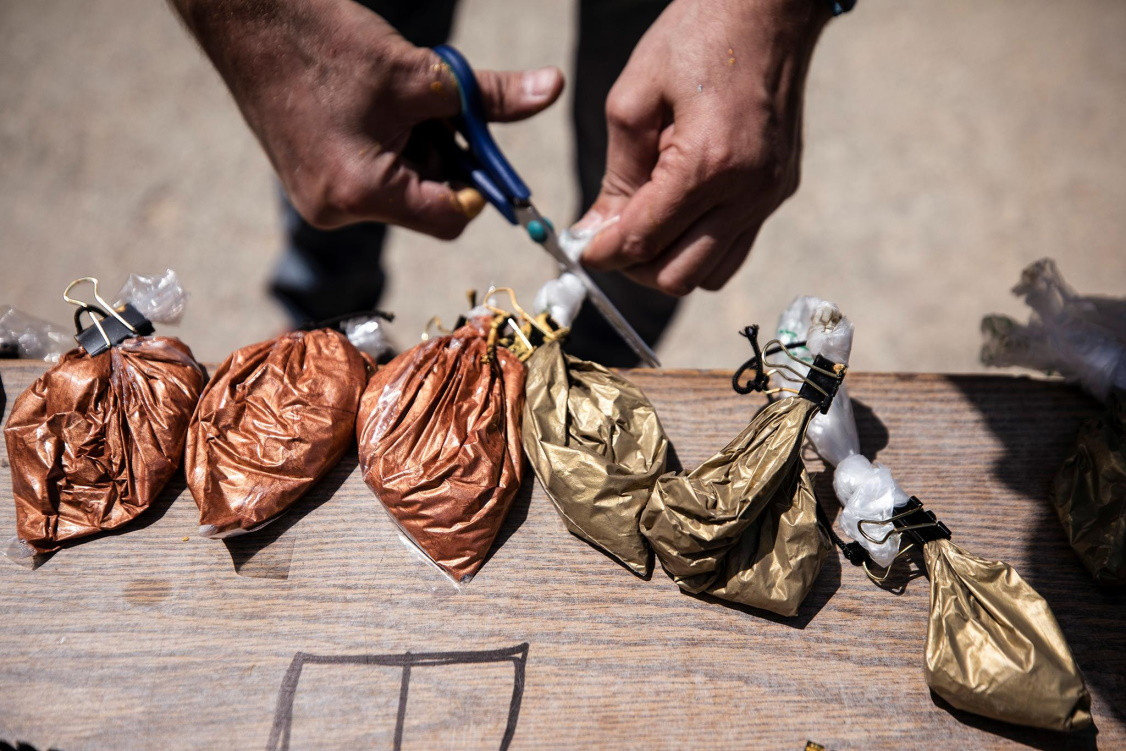 Для создания каждой картины он сначала заготавливает мешочки с краской.