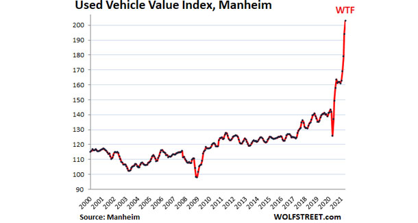 При этом этот рост цен происходит на фоне падения продаж новых авто. Америкосы на дрожжах свежеотпечатанных ковидловых пособий покупают больше (на 10.6% по сравнению с маем 2019), однако при этом произошел обвал на 49% бизнес-продаж (fleet sales), так как фирмы по аренде авто и такси начали всплывать кверху пузом — поэтому совокупные продажи новых авто просели на 2%.