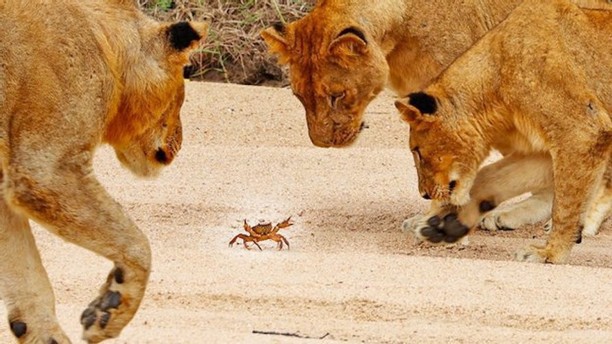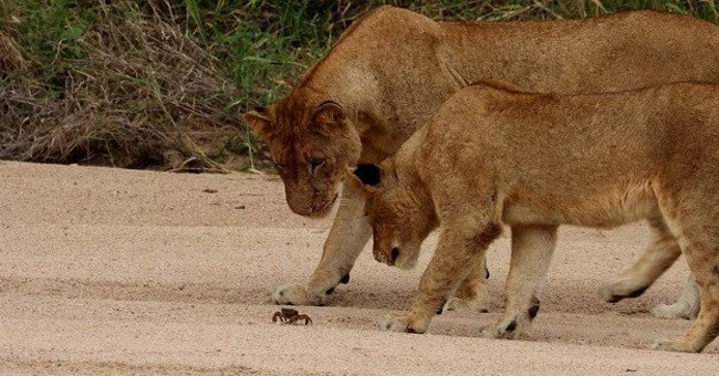 Группа туристов, осматривавшая заповедник Мала-Мала в Южной Африке, заметила льва из прайда Камбула, который пристально за кем-то наблюдал. Сначала люди решили, что внимание льва привлек скорпион в песке, но затем стало ясно, что объектом наблюдения был краб. Когда лев подошел поближе, он угрожающе поднял свои клешни и невозмутимо продолжил свой путь.