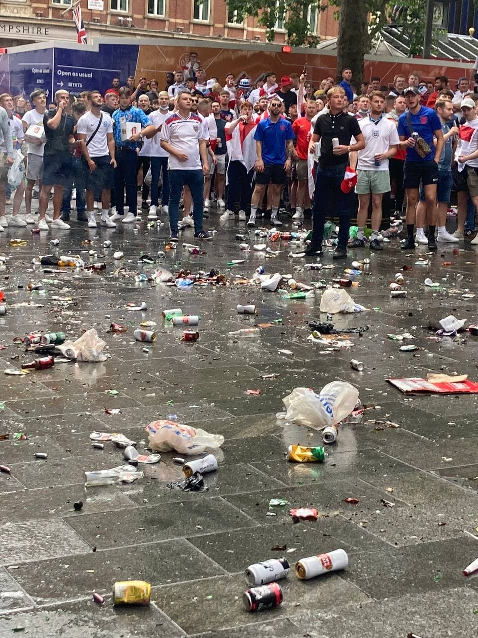 Лондон. В неофициальной фан-зоне английские болельщики готовятся к финалу Евро-2020. Хотя, на первый взгляд, это больше похоже на свинарник