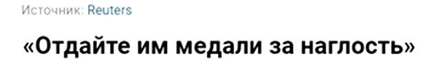 Тема российской «наглости» ещё раз жирно подчеркнута одним из подзаголовков «Отдайте им медали за наглость», взятом в кавычки, что явно указывает на цитирование таких вызывающих слов. Однако в самом тексте статьи никаких «медалей за наглость» нет и в помине! Можете сами убедиться: