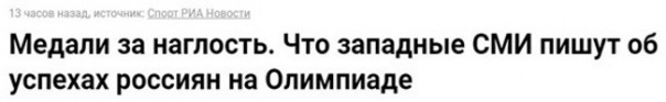 Но самое поразительное, что данный материал озаглавлен «Медали за наглость. Что западные СМИ пишут об успехах россиян на Олимпиаде». То есть с явной претензией на то, что именно такова точка зрения западных комментаторов.